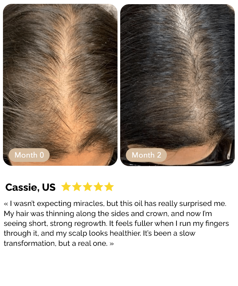 Schon nach wenigen Wochen wuchsen mir die ersten feinen Härchen an den Schläfen. Dieses Öl hat wirklich geholfen, die lichten Stellen aufzufüllen und pflegt meine Kopfhaut wunderbar.