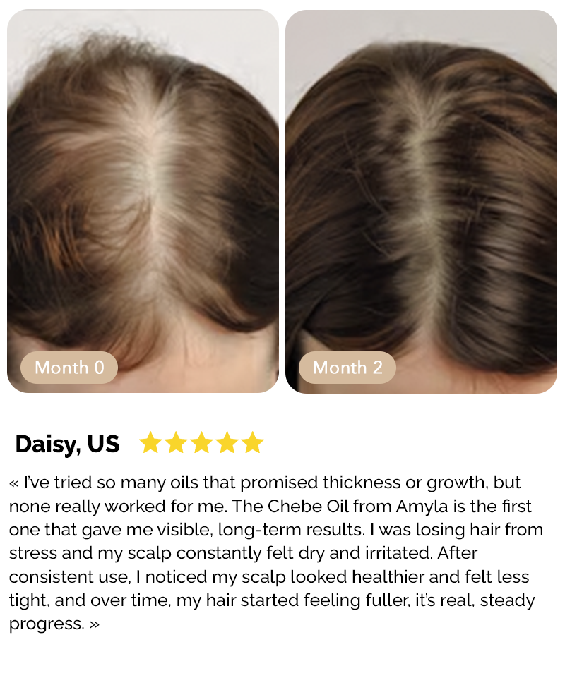 „Ich war ehrlich gesagt beeindruckt, wie schnell das Chebe Haarwuchsöl wirkte. Innerhalb von zwei Wochen fühlte sich meine Kopfhaut gesünder an, und ich bemerkte, wie neue Babyhaare an den Haaransätzen wuchsen. Es ist leicht, fettet nicht und macht mein Haar weich und pflegt es intensiv. Definitiv ein neuer Favorit in meiner Pflegeroutine.“