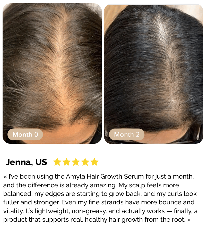 „Ich benutze das Haarwuchsserum von Amyla Cosmetics seit zwei Wochen und sehe schon einen deutlichen Unterschied. Mein Haar fühlt sich kräftiger, weicher und besser mit Feuchtigkeit versorgt an. Außerdem riechen die Produkte fantastisch und sind super einfach anzuwenden! Es ist aus meiner Haarpflegeroutine nicht mehr wegzudenken – ich bin total begeistert!“