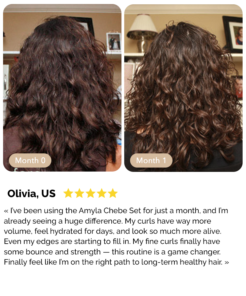 „Ich benutze das Chebe Set seit zwei Wochen und sehe schon einen deutlichen Unterschied. Mein Haar fühlt sich kräftiger, weicher und gepflegter an. Außerdem riechen die Produkte fantastisch und sind super einfach anzuwenden! Es ist aus meiner Haarpflegeroutine nicht mehr wegzudenken – ich bin total begeistert!“