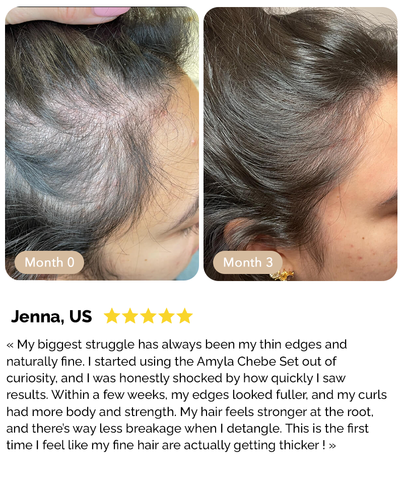 Für alle, die unter dünner werdendem Haar, Haarausfall oder kahlen Stellen – insbesondere an den Schläfen – leiden, kann Chebe eine echte Veränderung bewirken. Es stärkt schwaches, trockenes Haar und spendet Feuchtigkeit, wodurch das Haar gesünder und voller aussieht. Bei regelmäßiger Anwendung hilft es, Haarausfall zu reduzieren, die Haardichte zu verbessern und das Volumen an Stellen wiederherzustellen, an denen das Haar zu Brüchigkeit oder Lichtmangel neigt.